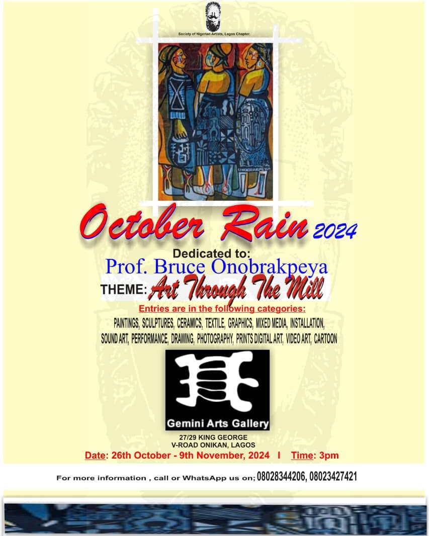 In November 2024, the Society of Nigerian Artists (SNA) Lagos State Chapter presented the 18th edition of its annual exhibition, “October Rain,” under the theme “Art Through the Mill.” This year’s exhibition was notably significant as it honored the legendary Professor Bruce Onobrakpeya, a foundational figure in Nigerian art.